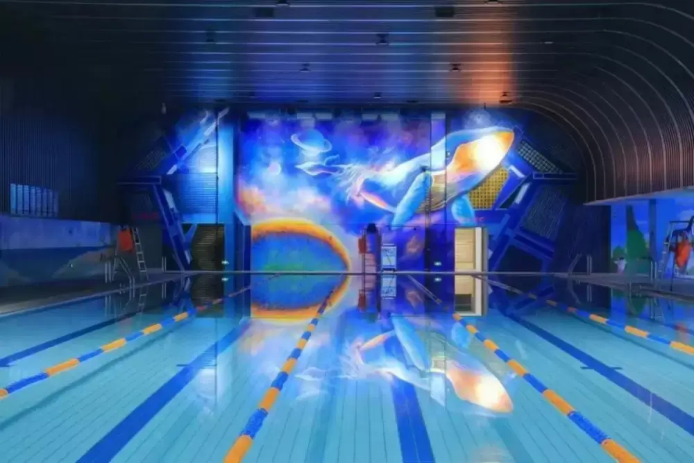 南京田家炳高级中学人防工程游泳馆是全市首家以人防体育文化空间为特色的游泳馆,坐落于田家炳高级中学人防负2层,拥有标准赛道泳池、小型游泳池、戏水池等多类型泳池。以海洋3D动漫为主题,采用3D 动漫墙绘与灯光设计,运用3D长廊、荧光网红墙(大蓝鲸)等融入互动技术,开发立体空间交互环节,并以3D动画技术打造深海环境,构筑新型地下水上乐园,全方位营造空间动态美感,打造沉浸式、科技化、可持续的全新体验,在满足教育需求的同时向市民开放,进一步扩大公共体育普惠范围。