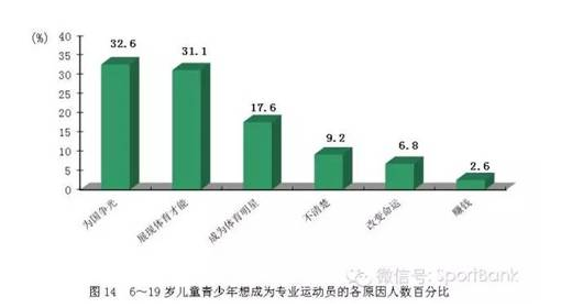 在接受调查的6~19岁儿童青少年中,有16.9%的人愿意成为专业运动员,成为专业运动员的原因主要是“为国争光”和“展现体育才能”(图14)。