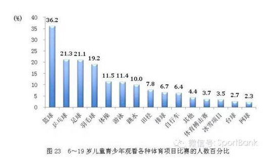 6~19岁儿童青少年观看篮球比赛的人数百分比最高,为36.2%,其它依次为乒乓球、足球、羽毛球、体操和游泳等(图23)。