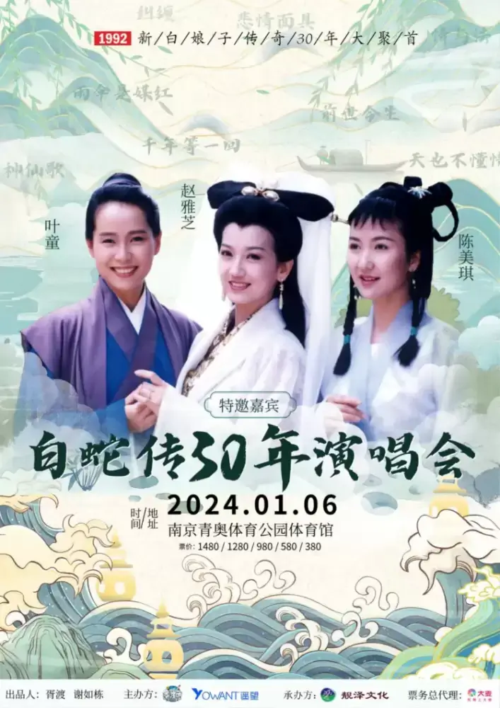 《白蛇传》30年演唱会于2024年1月6日在南京青奥体育公园体育举办馆。当年剧中的主演白娘子/赵雅芝、许仙/叶童、青蛇/陈美琪、碧莲/夏光莉及王道灵/鹿峰、观音/阮虔芷、采因/徐慧宣、张玉堂/李秉桦、白福/李冠廷等其他重要角色演员、歌手高胜美、原版《新白》配音团队、FORMOSA和音配唱团队联合创意神配音团队胥渡吧共同献声,这是《新白娘子传奇》播出30年来的首次ost演唱会,也是嘉宾阵容最为齐整的30年大聚首。