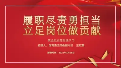 2022-07-27 7 647为进一步深入学习习近平总书记重要讲话精神,根据集团党委工作部署,并结合紫金支部月度学习计划,7月26日,集团党委副书记王虹燕为紫金支部全体党员进行了主题为《履职尽责勇担当 立足岗位做贡献》的党课讲授。
