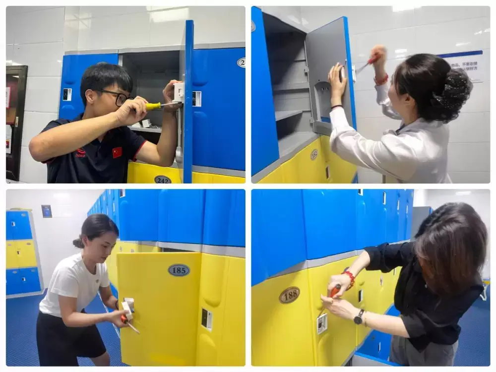 最后,参加活动的全体党员同志来到游泳馆男女更衣室开展志愿服务。场馆处于运营高峰期,客流量巨大,由于空气比较潮湿,出现更衣柜门锁频繁故障等问题,党员同志在此时“站出来、顶上去、冲在前”,主动协助场馆更换更衣柜锁芯,开展游泳馆地面清扫工作,深入一线“为群众办实事”。