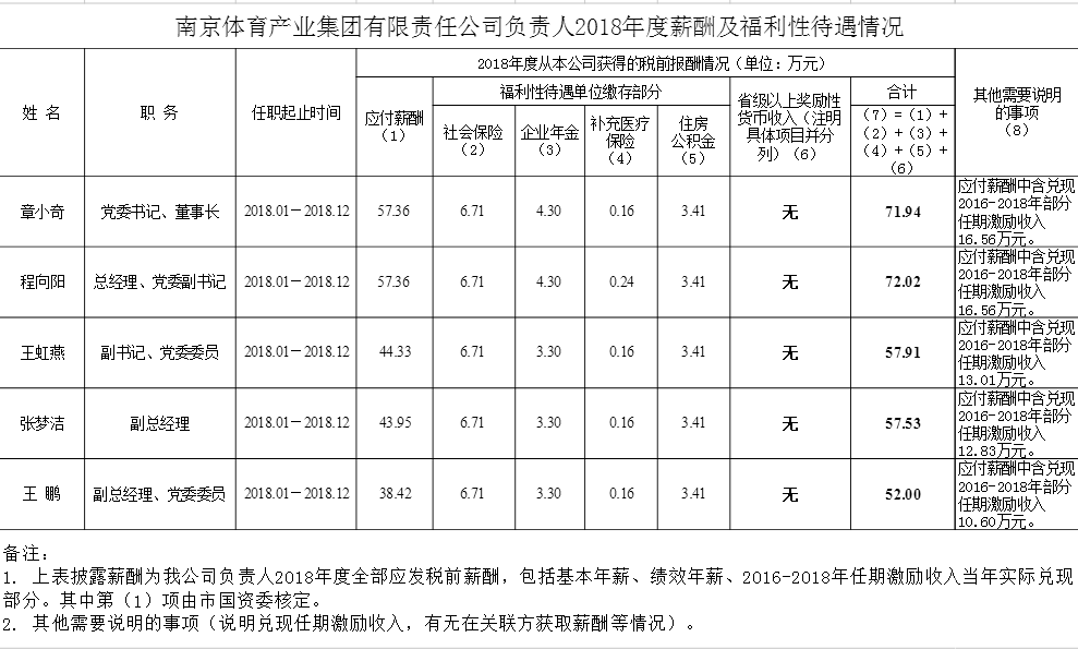 » 南京体育产业集团有限责任公司负责人2018年度薪酬及福利性待遇情况
