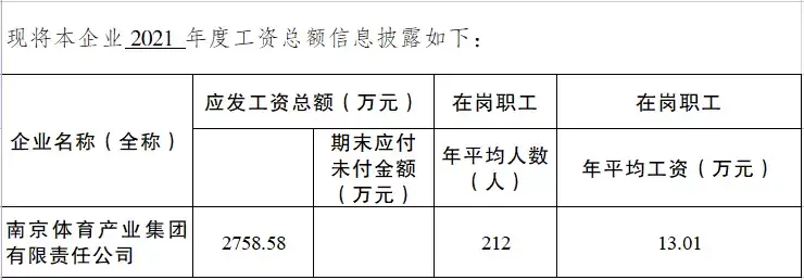 2021年南京体育产业集团有限责任公司工资总额信息披露