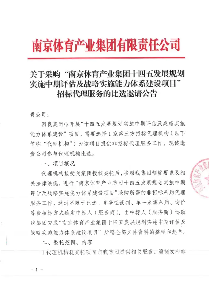 因我集团拟开展“南京体育产业集团 2023年度经济责任审计项目中介机构 选聘”项目,需要选择1家第三方招标代理机构(以下简称“代理机构”)为该项目提供非招标代理服务工作,现诚邀贵公司参与代理机构比选。