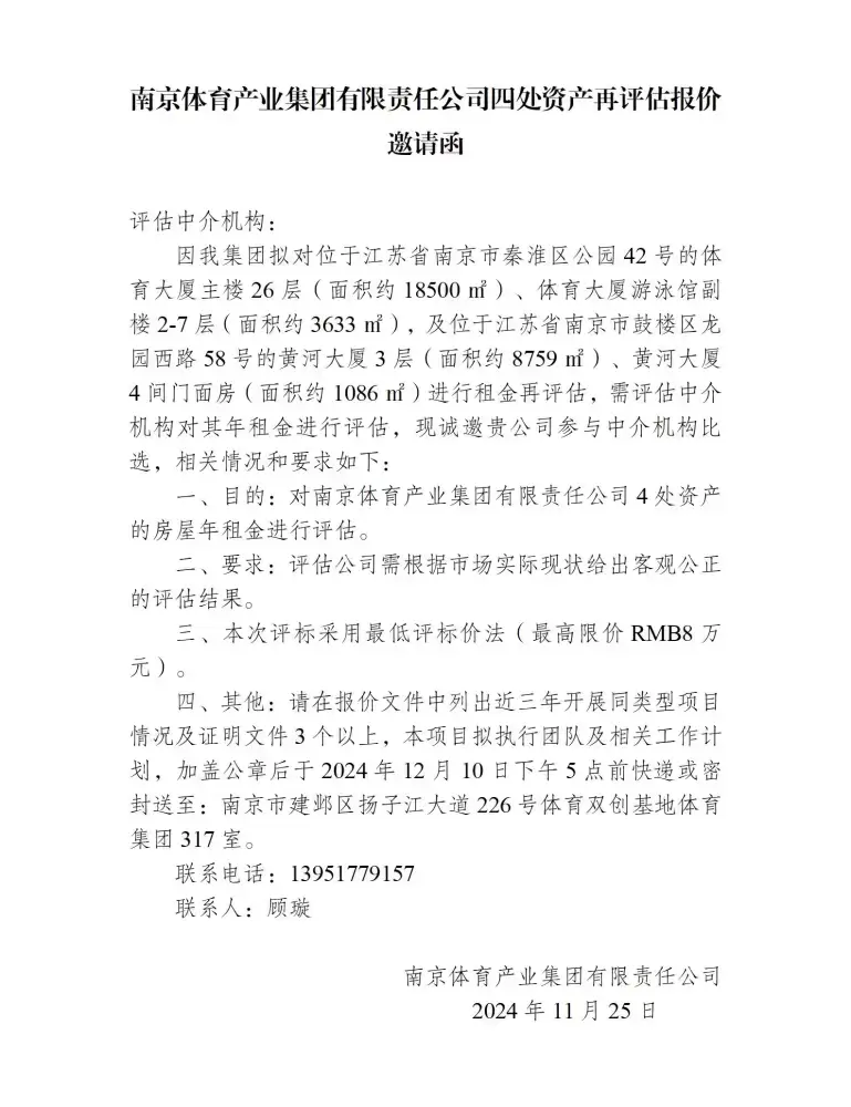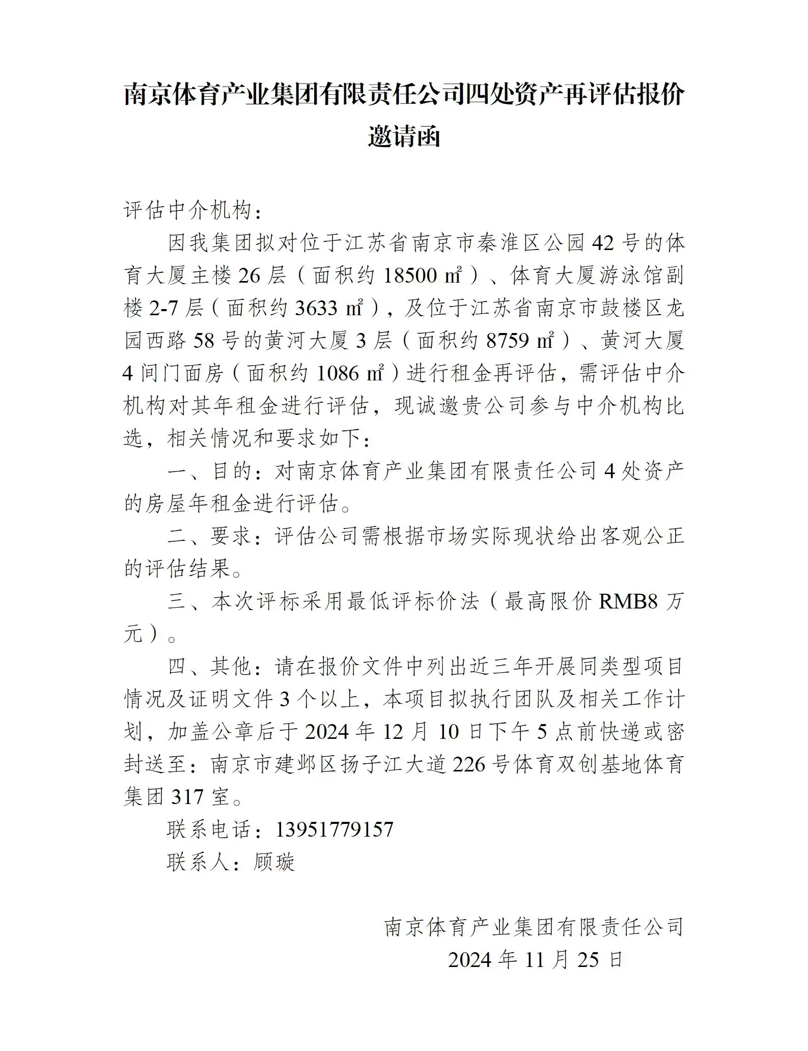 南京体育产业集团有限责任公司拟以公允价值计量所涉及的投资性房地产项目评估报价邀请函