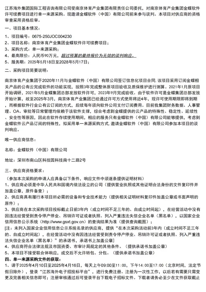 南京体育产业集团金蝶软件许可续费项目单一来源采购公告