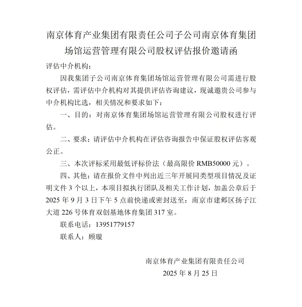 南京体育产业集团有限责任公司子公司南京体育集团场馆运营管理有限公司股权评估报价邀请函
