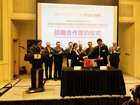 包括荣获美国商务部颁发金牌奖章的美国知名蹦床运动品牌美国Rockin’Jump在内的四家顶级美国知名连锁企业进行了品牌展示。会议一项重要环节为南京全民健身中心有限公司与中国区独家引进Rockin’Jump的奥建欢跃健身股份有限公司进行战略合作签约仪式。集团董事长章小奇、美方Cynthia Griffin参赞与出席活动的众位贵宾共同见证。该项目的第一间门店将于2017年底前后在全民健身善水湾网点开始营业,除了风靡美国的Rockin’Jump蹦床项目以外,还将引入Rockin’Learn课程,这是由美国Education X教育机构基于美国最新理论和实践开发研制的系列课程,全面融合瑞吉欧理念、蒙特梭利等知名理念,是目前世界领先的“全人”教育融合课程体系。预计未来五年左右时间,门店数量将达到10至20间,为南京市区及周边5000万人口带来纯正的美国健身、教育、培训的新体验。本项目同时也是全民健身品牌连锁国际化的一次有益探索和尝试,有助于丰富健身业态内容,并合理优化资源分配,进一步拉动大南京地区体育消费。