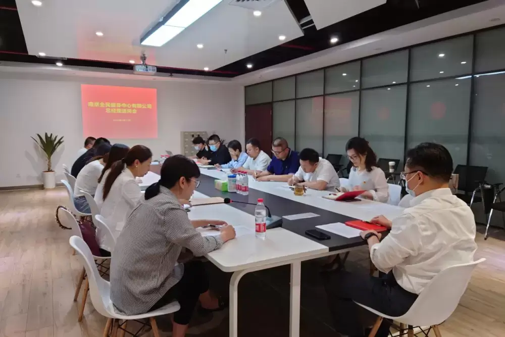 2022-05-30 4 7435月27日下午,南京全民健身中心有限公司新任总经理送岗会在全民公司6楼会议室召开。集团党委书记、董事长章小奇,党委副书记王虹燕,副总经理、党委委员王鹏以及党群工作与人力资源部和全民公司、青奥公司中层以上管理人员参加会议。