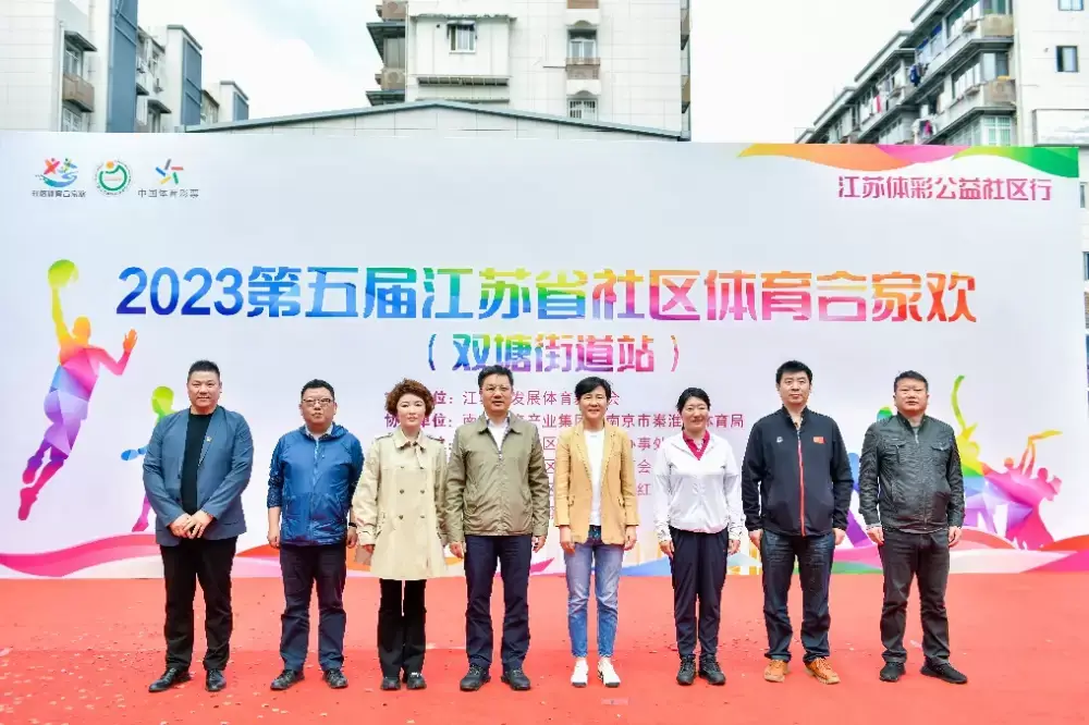 2023-05-9 1 6425月7日上午,由江苏省体育局、南京市体育局指导,江苏省发展体育基金会主办,南京体育产业集团、南京市秦淮区体育局协办,南京市秦淮区双塘街道办事处承办的“江苏体彩公益社区行—2023第五届江苏省社区体育合家欢”(双塘街道站)活动在南京市秦淮区双塘街道五福社区居民广场圆满举行。江苏省发展体育基金会副秘书长张爱英、南京体育产业集团党委委员王璎以及秦淮区文化和旅游局(体育局)、秦淮区双塘街道等相关单位领导出席活动。