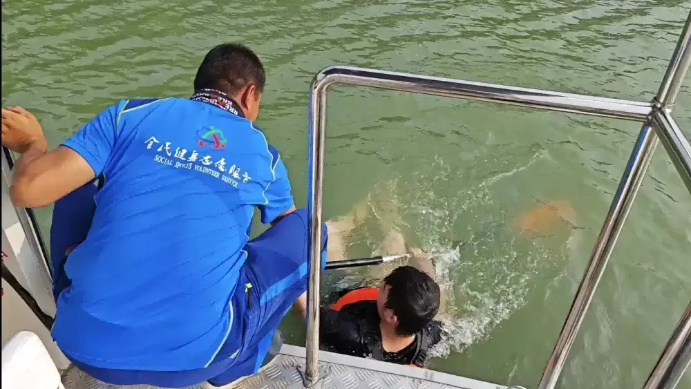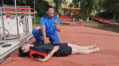 最后,安全指导员对赛事教练组进行安全应急预案宣贯,并模拟水上赛事人员意外落水开展应急救援。赛事过程中,参赛人员意外落水,教练组立即驾驶救援艇赶到附近,将落水人员救援至码头并进行心肺复苏,并借此向全员详细讲解心脏按压的部位、频率及操作要点等,普及日常急救知识。