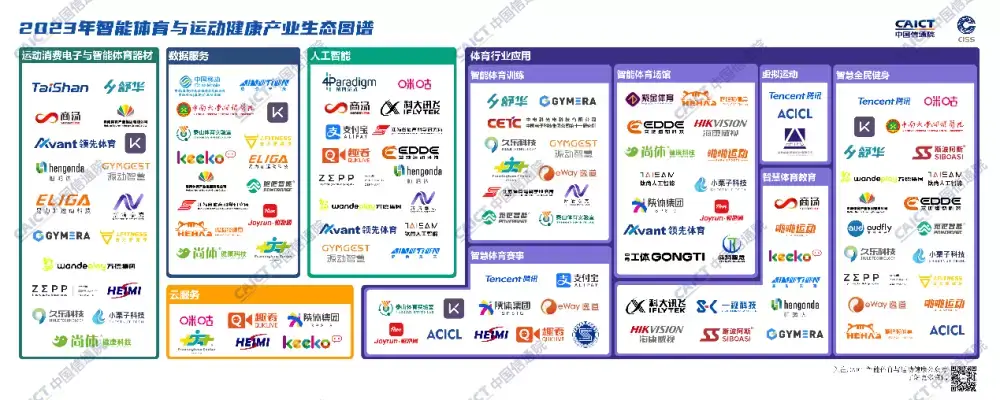 随着人工智能、5G通信、物联网、大数据、智能硬件、虚拟现实/增强现实等新一代信息技术与体育产业加速融合,智能体育有力推进了体育产业的高质量发展,为梳理产业链上下游企业、产品及运动场景的分布情况,评估产业发展现状,洞察产业发展趋势,促进国内智能体育与运动健康相关产业发展,助力传统体育企业数字化转型,工信部与体育总局科研所联合发布了《2023年智能体育与运动健康产业生态图谱》。图谱分为运动消费电子与智能体育器材、人工智能、数据服务、云服务和体育行业应用五个板块,各板块由全国的行业领军企业组成。