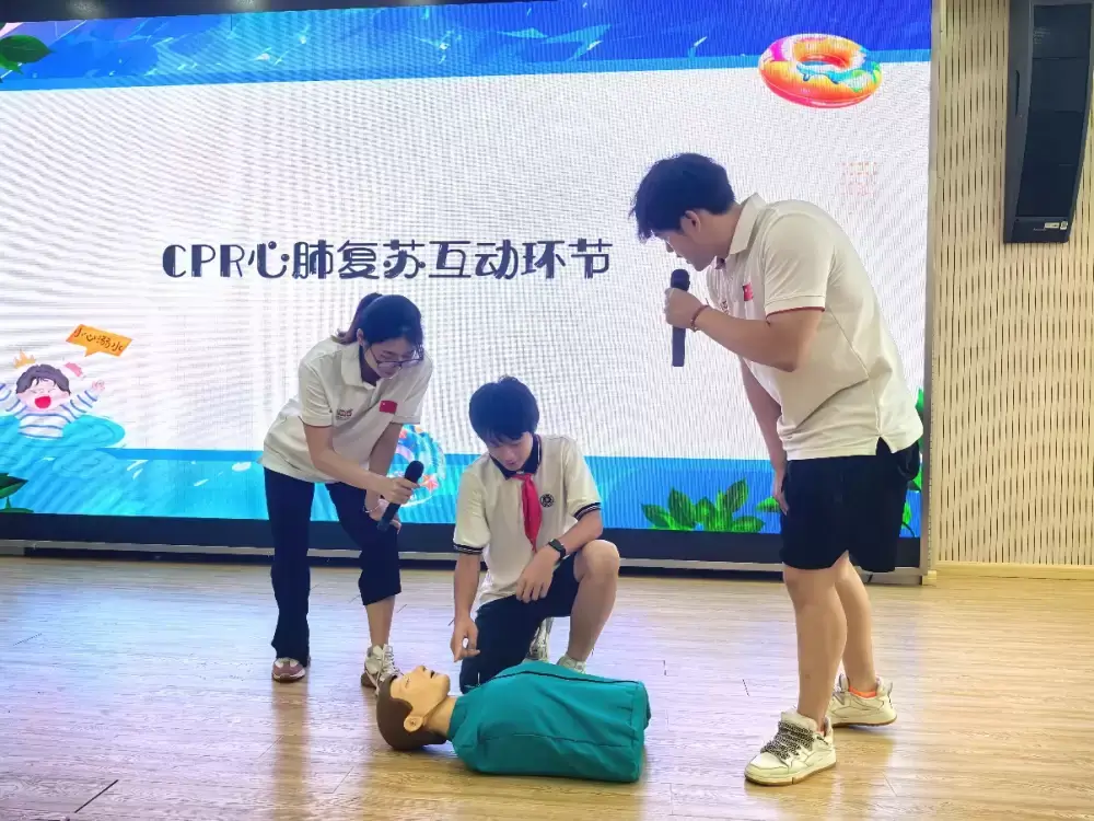 “如果遭遇溺水,有几个小技巧一定要掌握。一是抬头,屏住呼吸,将嘴巴、鼻孔轻轻露出水面,之后再慢慢呼吸,切记不能重呼吸,二是身体放轻松是关键,背部要挺起来,双手轻轻展开,人就可以自然地漂浮在水面上了。”现场还设置了多个模拟场景,亲身示范CPR心肺复苏教学,与孩子们热情互动,让他们体验如何在危急情况下保护自己。