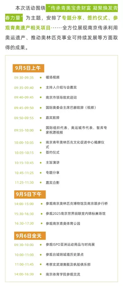 本次活动围绕“传承青奥宝贵财富 凝聚焕发青春力量”为主题,安排了专题分享、签约仪式、参观青奥遗产相关项目……全方位展现南京传承利用奥运遗产、推动奥林匹克事业可持续发展等方面取得的成果。