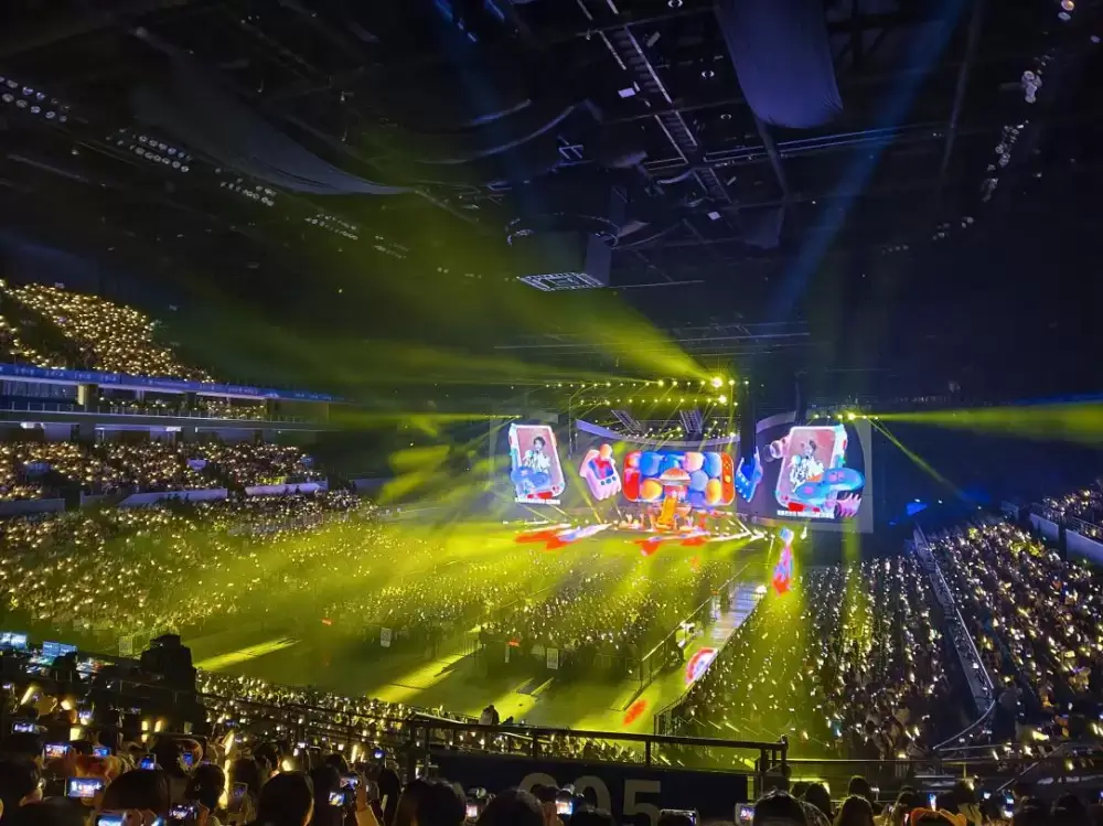 欢呼声、尖叫声交织成一曲激情澎湃的前奏,尚未开场,现场已然是一片欢乐的海洋。当灯光渐暗,演出正式拉开帷幕,五彩斑斓的荧光棒在黑暗中挥舞闪烁,如同点点繁星汇聚,照亮了整个空间,也点燃了每个人心底那份纯粹的快乐。巨大的充气汉堡滑梯出现的瞬间抓住了所有人的眼球,配合着高饱和度的多巴胺背景色彩和灯光特效,打造出一个奇幻绚丽的世界。舞台上一个个可爱的emoji表情造型,与台下观众们的热情互动,营造出一种独一无二的欢脱氛围,将现实世界的烦恼统统隔绝在外,此刻,这里俨然成为了众人心中理想的乌托邦乐园。