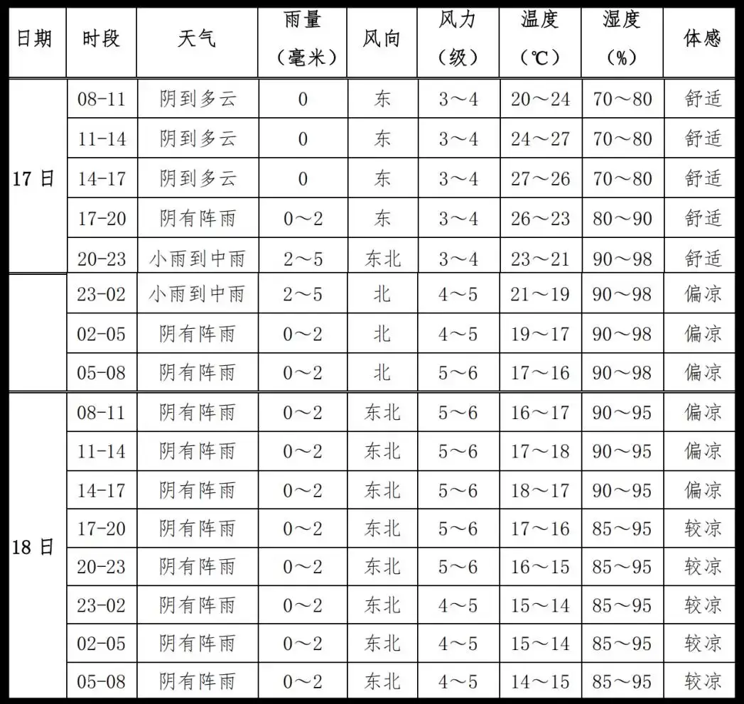 根据最新气象资料分析,17日—18日阴有阵雨。受较强冷空气影响,17日夜里起至18日有明显降温天气,并伴有5~6级阵风7级的东北大风。“苏超” 足球比赛期间(18日19 时—22时)奥体中心附近阴有阵雨,雨量1~3毫米,东北风5级阵风6级,气温17~15℃,相对湿度85~95%,比赛期间体感较凉,请注意保暖。