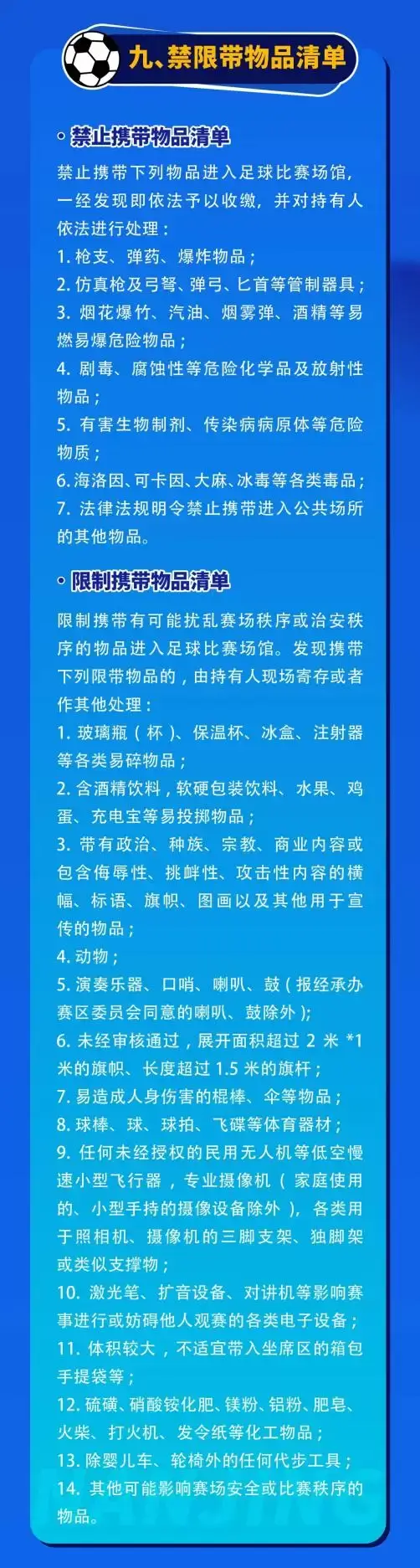 1、入场观众务必遵守对号入座的赛场秩序管理规定,一旦有因未对号入座产生纠纷的情况,现场工作人员有权将不服从指挥和规定的球迷请出场外并禁止其观看本场比赛。情节严重者,还将承担相应法律责任。