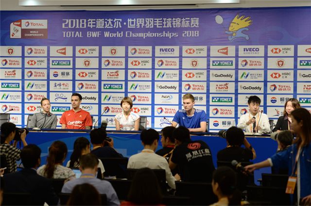 2018年道达尔·世界羽毛球锦标赛将于7月30日在南京青奥体育公园正式开赛。上午,中国队男单选手谌龙,男双选手刘成、张楠,女双选手陈清晨、贾一凡,丹麦队男单选手维克多·安塞龙,日本队女单选手奥原希望,英格兰队混双选手怀特、爱德考克出席了赛前新闻发布会,接受媒体提问。