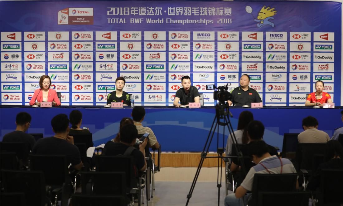 发布会现场,中国羽毛球协会副主席、中国羽毛球队单打组主教练夏煊泽,中国羽毛球协会副主席、国家羽毛球队男子双打组主教练张军分别介绍了中国羽毛球队单双打的整体情况以及此次世锦赛的出阵阵容。夏煊泽在发布会上表示:“此次参加羽毛球世界锦标赛的男子单打是谌龙、林丹、黄宇翔等,女子单打是南京选手何冰娇等三个人参赛。虽然天气还是比较热,但从各个方面来说,运动员整体的适应还是不错的,目前都在积极的备战当中,明天开始将整体进入比赛的节奏。”