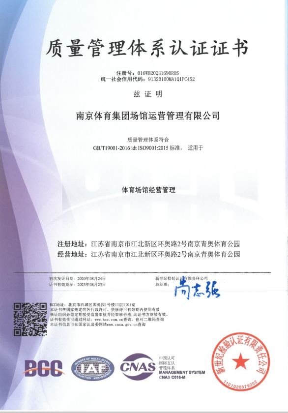 2020年8月,ISO9001质量管理体系认证审核专家组对场馆公司正式进行认证审核。审核组专家分组开展文件审阅、记录检查、询问交谈、现场检查,全面细致地审核了公司领导层、综合办公室、物业服务中心、市场部的全部工作。通过全面认真审查,审核组专家对场馆公司ISO9001质量管理体系的运行给予了高度评价和充分肯定。最终,审核组专家认为场馆公司的质量管理体系规范有序切实可行,并扎实地落在服务工作中,一致审定场馆公司通过质量管理体系认证。8月24日,场馆公司获得由新世纪检验认证有限责任公司颁发的《质量管理体系认证证书》。