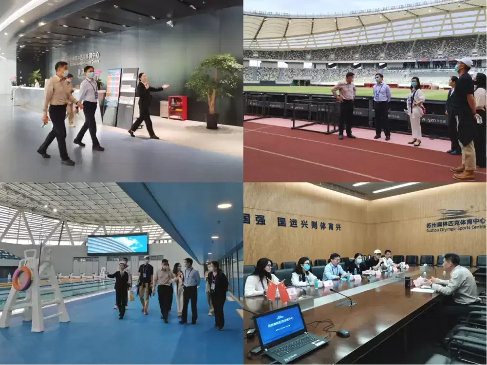 在苏州奥体中心集团一行详细了解了苏州奥体中心的园区景观布局、流线安排、体育场、游泳馆等场馆的设计功用,重点考察了全民健身项目下各类运动项目布局规划、配套设施设备建设及相关便民服务内容。交流会上,双方围绕智慧化场馆建设、大型赛事承办经验与创新、体育旅游营销策略、赛事保障及场馆运维成本和财政补贴政策等方面进行了座谈交流。