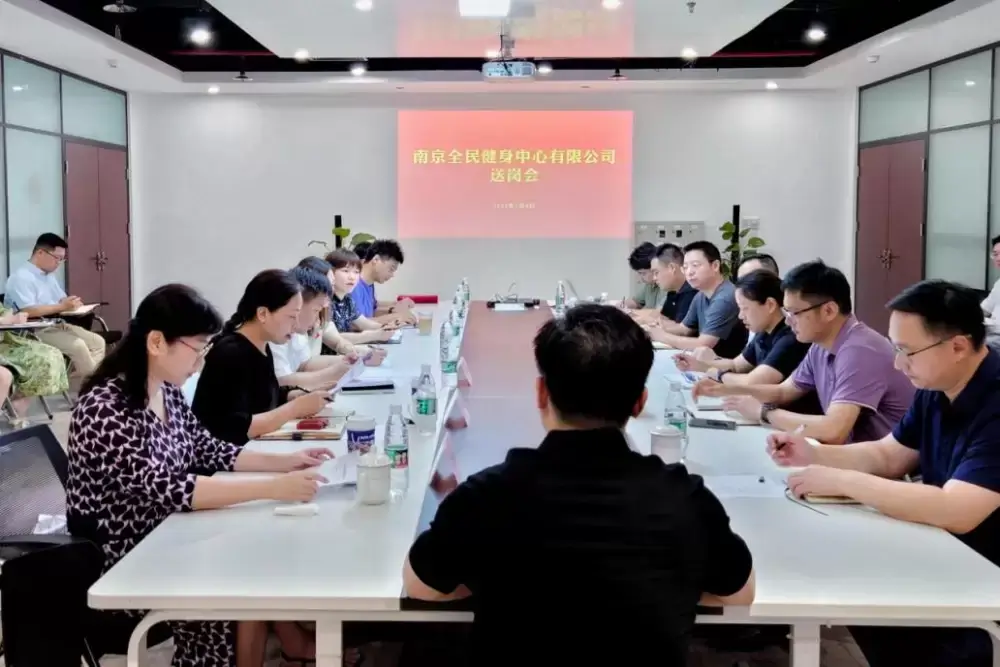 2023-07-5 11 8247月4日上午,南京全民健身中心有限公司新任干部送岗会在全民公司6楼会议室召开,集团党委书记、董事长章小奇,党委副书记王虹燕,副总经理、党委委员王鹏、集团党群工作与人力资源部、全民公司经理层和在岗员工出席会议。
